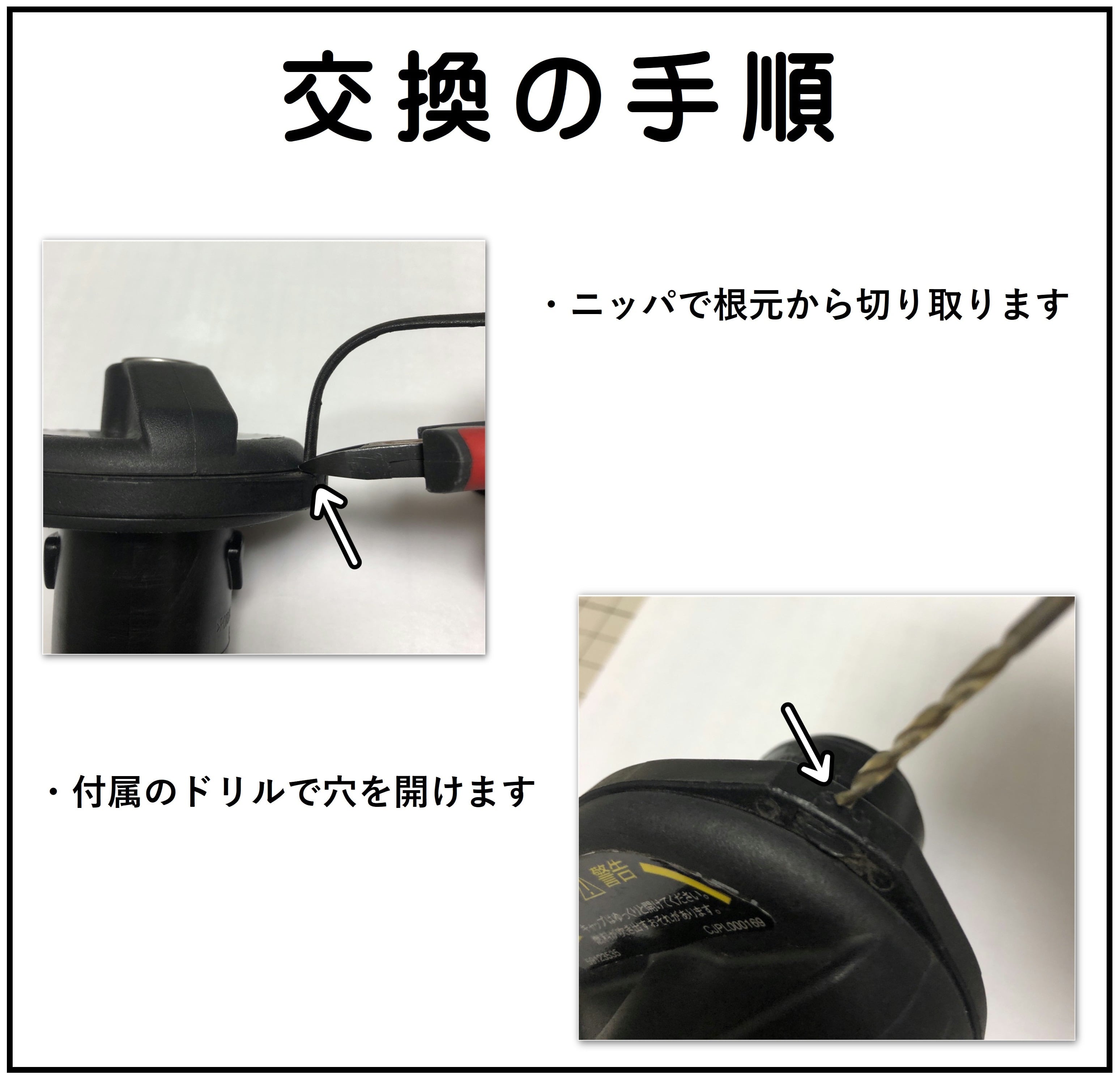 切れたゴムを根本から切り離した後にリングに付属のドリルで穴を開け、ねじ込み黒ゴム接着剤を肉盛りすることで取付けできます。